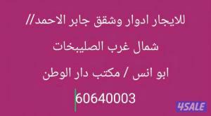 للايجار أدوار وشقق في جابر الاحمد/ شمال الصليلخات/ سعد العبد الله