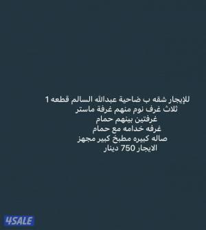 السعر: 750 نشر منذ 3 ساعة و 21 دقيقة للإيجار شقه ب ضاحية عبدالله السالم قطعه 1