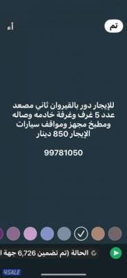 السعر: 850 نشر منذ 2 ساعة و 34 دقيقة للإيجار دور بالقيروان ثاني مصعد عدد 5 غرف وغرفة خادمهوصاله ومطبخ مجهز ومواقف سيارات الإيجار 850 دينار