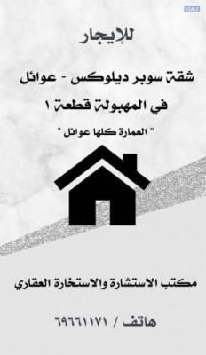 شقة سوبر ديلوكس ٢ غرفة نوم كبيره و صاله كبيره و ١ حمام و مطبخ كبير و مجهز و بلكونه و مدخل ومخرج سهل جداً جداً العمارة كلها عوائل الأجار ٢٧٠ دينار مكتب/ الإستشارة و الإستخارة العقاري نستقبل جميع العروض العقارية من الساده الملاك بيع و شراء و تاجير و بدل و إدارة املاك الغير