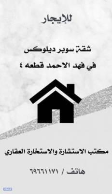 شقة. سوبر سوبر ديلوكس جديده لم تسكن ٣ غرف نوم كبيره وحده ماستر وغرفتين بينهم حمام و صاله و مطبخ كبير و مجهز و غرفة. غسيل و مصعد و مدخل خاص و سكن المالك و تكييف مركزي و سخان مركزي و موقفين مطلوب عائلة صغيره. أو معاريس الأجار ٤٣٠ دينار مكتب/ الإستشارة و الإستخارة العقاري نستقبل جميع العروض العقارية من الساده الملاك بيع و شراء و تأجير و بدل وإدارة املاك الغير