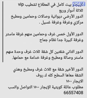 السعر: 1500 نشر منذ 2 ساعة و 24 دقيقة للإيجار بيت كامل في المطلاع تشطيب vip