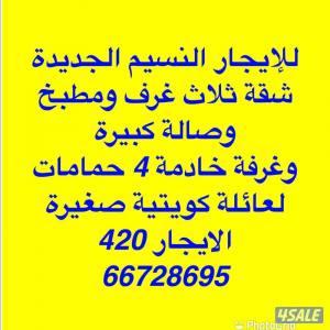 السعر: 7 نشر منذ 13 ساعة و 2 دقيقة 1- للإيجار شقة النسيم الجديدة ثلاث غرف وصالة ومطبخ وغرفة خاد مه واربعة حمامات لعائلة كويتية صغيرة 420 دك