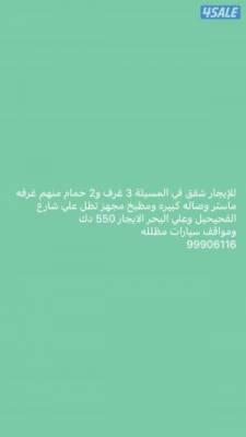 السعر: 550 نشر منذ 9 ساعة و 8 دقيقة للإيجار شقه بالمسيلة 3 غرف و2 حمام وصاله كبيره ومطبخ مجهزه شقه كبيره تطل علي شارع الفحيحيل واطاله علي البحر ومواقف سيارات مظلله الايجار 550 دك