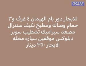 السعر: 350 نشر منذ 6 ساعة و 11 دقيقة للايجار دور بام الهيمان ق٣