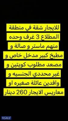السعر: 260 نشر منذ 3 ساعة و 45 دقيقة للايجار شقة في منطقة المطلاع 3 غرف وحده منهم ماستر و صالة و مطبخ كبير مدخل خاص و مصعد مطلوب كويتين و غير محددي الجنسيه و وافدين عائلة صغيره او معاريس الايجار 260 دينار