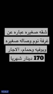 السعر: 170 نشر منذ 2 ساعة و 39 دقيقة شقه صغيره عباره عن غرفة نوم وصاله صغيره وبوفيه وحمام
