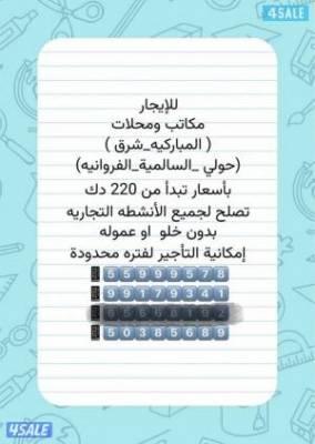 للايجار مكاتب ومحلات في المباركيه وشرق والفروانيه وحولي تبدا ب220 دك