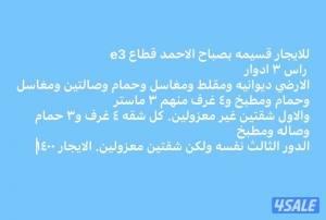 ويوجد شقق صباح الاحمد جميع القطاعات اسعار مختلفه ويوجد قسيمه دورين وربع ايجار700 ويوجد قسيمه ثلاث ادوار نظام شقق 1400