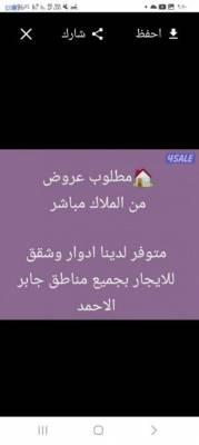 السعر: 1 نشر منذ 1 يوم و 19 ساعة للايجار شقتين جابر الاحمد ق٧ تتكون من ٣غرف وصاله ومطبخ وحمامين