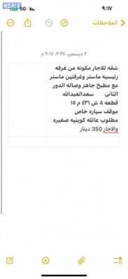 إيجارات الكويت - شقة دور ثاني غرفة رئيسية ماستر +غرفتين ماستر مطبخ جاهز وصالة