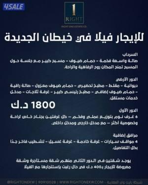 السرداب: صالة فخمة، حمام ضيوف، مسبح كبير مع جلسة خارجية. الارضي: ديوانية، مقلط، صالة، ٢ حمام ضيوف، مطبخ رئيسي كبير + تحضيري، مدخل خدمات. الأول: ٦ غرف نوم، كل غرفتين بجناح خاص، مدخلين خارجي وداخلي. المرافق: ٤ مواقف، غرفة خادمة، غرفة غسيل، تشطيب فاخر. الإيجار: 1800 د.ك. ( ملاحظة : الدور الثاني مؤجر .