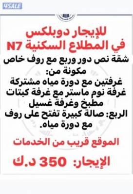 السعر: 350 نشر منذ 5 يوم للإيجار في المطلاع السكنية N7، شقة دوبلكس، مكونه من: