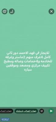 نشر منذ 4 يوم للإيجار في فهد الاحمد دور كامل 4غرف منهم 2ماستر وغرفه للخادمه و4حمام وصاله ومطبخ تكييف مركزي ومصعد وموقفين سياره