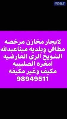 *لايجار مخاذن في امغره تصلح جميع الانشطة التخذينيه مطافي وكهرباء وبلديه 5000م تقسم * للإيجار بالصليبيه مخاذن 1000م 2000م ارتفاع عالي ارضيه كونكريت معزول مع كهرباء وزاره وحراسه * للإيجار بالعارضيه قسيمه 4500م غذائي وتخزين و2000م سرداب للتخزين 1000م سرداب للتخزين * للإيجار بالصليبيه مخازن تجاريه 1000م مجهزه بالكامل علي اعلي مستوي قابله للتقسيم * للإيجار في ميناء عبدالله مخازن . ارتفاع عالي ، ارضيه كونكريت ، معزوله مع كهرباء ومطافي 1000م 1250م 2500م 5000م 10000م *للإيجار في الشويخ والري مخازن 500م و1000م 2000م 3500م * للإيجار بالمنطقة الحره مبني بالكامل يصلح اداره او اي نشاط تجاري * للإيجار في صبحان 3000م يقسم يصلح جميع الانشطه التخزينيه * للإيجار بالخويسات مخازن 1000م 1500م 2000م 2500م ارتفاع عالي ارضيه كونكريت معزول مع كهرباء مساحات مختلفه