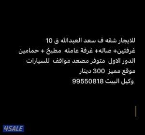 السعر: 300 نشر منذ 3 ساعة و 2 دقيقة للايجار شقه ف سعد العبدالله ق 10
