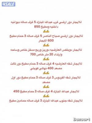 ✍️✍️ للايجار دور ارضي صباح الناصر 5 غرف صاله 3 حمام مطبخ 600 الايجار ✍️✍️ للايجار دوبلكس العارضيه دورين وربع مدخل خاص وساحه وارتداد 20 متر خاص 700 ✍️✍️ للايجار شقه العارضيه 4 غرف صاله 3 حمام مطبخ دور ثالث مصعد 400 نهائي كويتي ✍️✍️ للايجار شقه الفردوس 3 غرف صاله 3 حمام مطبخ دور اول مصعد ✍️✍️ للايجار عبدالله المبارك 4 غرف صاله 3 حمام مطبخ 450 ✍️✍️ للايجار شقه جنوب عبدالله المبارك 3 غرف صاله حمامين مطبخ مطلوب ادوار وشقق ايجار من الساده الملاك