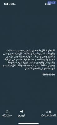 السعر: 12 نشر منذ 1 ساعة و 34 دقيقة للإيجار 4 فلل بالصديق تشطيب جديد للسفارات والهيئات الدبلوماسية وللعائلات كل فيلا تحتوي على 3 أدوار ونص وسرداب أدوار مفصولة وفي كل دور مطبخ وغرف للخ عدد 9 غرف ماستر في كل فيلا والسرداب والأرضي صالات كبيرة شرحة مفتوحة وحوش ساقط للسرداب عدد 5 مواقف لكل فيلا يمنع الوسطاء نهائي للحجز الأتصال