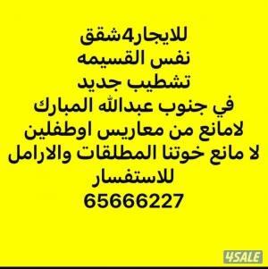 السعر: 350 نشر منذ 2 ساعة و 8 دقيقة للايجار4شقه في (جنوب عبدالله المبارك)