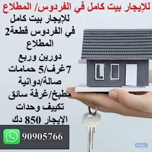 في الفردوس قطعة2 او المطلاع دورين وربع ديوانيه بكامل منافعها مدخل مستقل 7غرف-صالة-مطبخ-5 حمامات -غرفة سائ ق تكييف وحدات الايجار 850 دك |