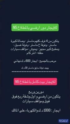 يتكون من 4 غرف كلهم ماستر - وصالة كبيرة ماستر - وغرفة خ ماستر - وغرفة غسيل - ومطبخ كبير مجهز - وحوش - مواقف سيارات مظله - انتر كام مرحب بالجميع - ايجار 600 د.ك نهائي يوجد غرفة س ماستر 30 د.ك ____________________________ للايجار بيت كامل بالمطلاع N5 دورين وربع يتكون من ارضي واول وشقة ربع فوق فوق ومواقف سيارات ايجار : 1000 د.ك والكهرباء على المال