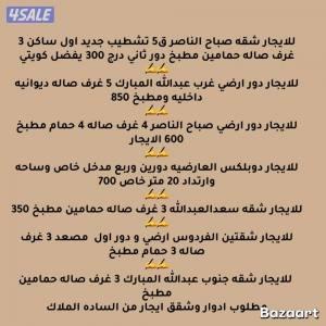 للايجار شقه صباح الناصر ودور غرب وشقتين الفردوس وسعد العبدالله