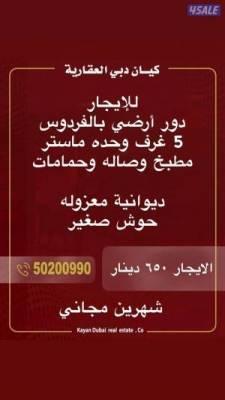 للإيجار دور ارضي بالفردوس قطعه٧ ديوانيه وخمس غرف وحده ماسترصاله ومطبخ