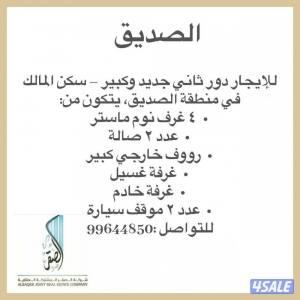 في منطقة الصديق، يتكون من: \t•\t٤ غرف نوم ماستر \t•\tعدد ٢ صالة \t•\tرووف خارجي كبير \t•\tغرفة غسيل \t•\tغرفة خاد \t•\tعدد ٢ موقف سياره
