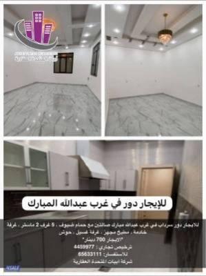 السعر: 700 نشر منذ 14 ساعة و 30 دقيقة للإيجار دور سرداب في غرب عبدالله مبارك مكون من 5 غرف منهم غرفتين ماستر وصالتين وحمام غرفة غسيل غرفة خ مع حمامها وحوش