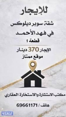 السعر: 370 نشر منذ 1 يوم و 17 ساعة للإيجار شقة سوبر ديلوكس في فهد الاحمد ق ١
