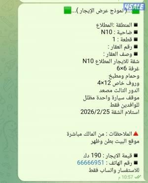 السعر: 190 نشر منذ 21 ساعة و 42 دقيقة للايجار شقة ستيديو في المطلاع N10