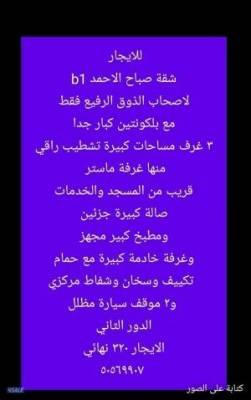 شقة في صباح الاحمد فطاع b1 قريبة من المسجد والخدمات متت ٣ غرفة كبار منها غرفة ناسور غرفتين بينهم حمام غرفة عا ملة مع حمام صالة كبيرة مطبخ كبير مجهز شباك شتر تكييف وسخان مركزي الايجار ٣٢٠ متوفر ب ٢٠٠ و ٢٥٠ و ٢٦٠ و ٢٨٠