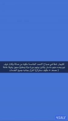 نشر منذ 1 ساعة و 27 دقيقة للايجار شقة في صباح الاحمد الخامسة مكونه من صالة وثلاث غرف نوم وحده منهم ماستر وثنتين بينهم دورة مياة ومطبخ مجهز وغرفة عاملـه ( مصعد + مكيف سنترال) المنزل بجانبه جميع الخدمات