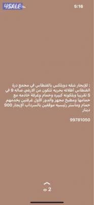 السعر: 900 نشر منذ 1 شهر و 16 يوم للإيجار شقه دوبلكس بالفنطاس في مجمع درة الفنطاس أطلاله بحريه تتكون من الارضي صاله 9 في 5 تقريبا وبلكونه كبيره وحمام وغرفة خادمهمع حمامها ومطبخ مجهز والدور الأول غرفتين يخدمهم حمام وماستر رئيسيه موقفين بالسرداب الإيجار 900 دينار