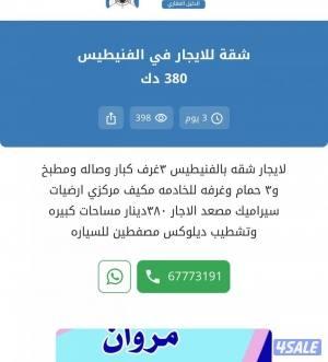 ٣غرف وصاله ومطبخ و٣ حمام وغرفه للخادمه مكيف مركزي ارضيات سيراميك مصعد الاجار ٣٨٠دينار |