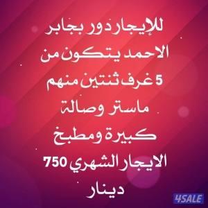 السعر: 750 نشر منذ 1 ساعة و 40 دقيقة للإيجار دور بجابر الاحمد يتكون من 5 غرف ثنتين منهم ماستر وصالة كبيرة ومطبخ الايجار الشهري 750 دينار