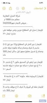٢ - للإيجار دور كامل في المطلاع ٣ غ - ٢ح - صاله كبيره مع مغاسل ومطبخ مجهز - غ غسيل و غ خ السعر ٥٠٠ ٣ - للإيجار شقه في المطلاع غ ماستر - ٢غ مع حمام - صاله ومطبخ - غ خ ٤ - للإيجار في المسايل دور كامل ٢غ ماستر - ٢غ - ٢حمام - صاله ومطبخ - غ غسيل - غ خ السعر ٧٥٠ ٥ - للإيجار بيت في الرقه دورين ع شارع رئيسي وفيه مصعد مع ٤ مواقف السعر ٧٥٠ ٦- للإيجار دور ارضي في منطقه الصديق السعر ١١٠٠ ٧ - للإيجار في المسايل دور كامل السعر ٧٥٠ ( يمنع الوسطاء والمكاتب منعا للإحراج ) |