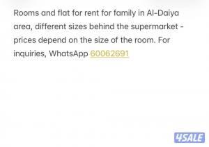 السعر: 10 نشر منذ 1 ساعة و 58 دقيقة غرف وشقق للايجار للعائله في منطقة الدعية، انواع مختلفه خلف السوبر ماركت - الاسعار تعتمد علي حجم الغرفه. للاستفسار، واتساب