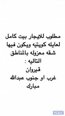 مطلوب للايجار بيت كامل لعائله كويتيه ويكون فيها شقه معزوله