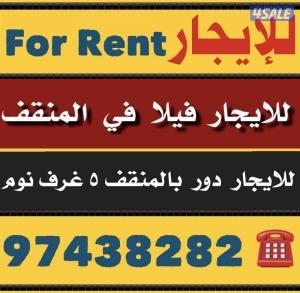 - ٥غرف نوم كبار - غرفة خ - ٥ حمام - صالة كبيرة - مطبخ كبير مع شفاط مركزي - تكييف مركزي - سخان مركزي - فلتر مركزي - غاز مركزي - تليفون ارضي - مواقف كثيرة - جميع الشبابيك بالكامل شتر كهرباء - موقع راس ٣ جهات علي شارع رئيسي (١) للإيجار فيلا كاملة بالمنقف دورين :- - الدور الارضي :- - غرفة نوم ماستر - 2 صالة كبيرة - مطبخ كبير - غرفة س مع - غرفة خ مع حمام - حوش كبير - ⛔️ الدور الاول :- - ٥ غرف نوم كبار - ٣ حمام - صالة - بلكونة كبيرة - السعر 1300 دينار - موقع ممتاز - تليفون/