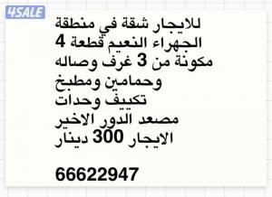 قطعه 4 مكون من 3 غرف وصاله و2 حمام ومطبخ وحدات تكييف يوجد مصعد الدور الاخير الايجار 300 دينار ——————-///////- —————-/////////// مطلوب للايجار شقة بالجهراء النعيم او القصر معاريس كويتي ———————— ————————- مطلوب بيت للشراء بالوفرة السكنية والدفع كاش الي مساحتهم 400 م مراجعة سته سته سته اثنين اثنين تسعه اربعه سبعه |